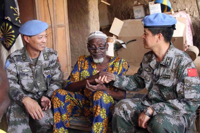 Chinese peacekeepers for the UN Mali Mission chat with an elder after bringing medicines to villagers in Gao, Mali on May 27, 2015. (Photo/Xinhua)