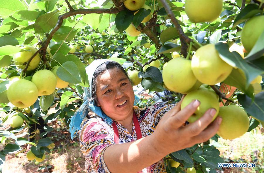Farmers sort pears in an orchard in Xundian Hui and Yi Autonomous County, southwest China's Yunnan Province, July 20, 2018. (Xinhua/Yang Zongyou)