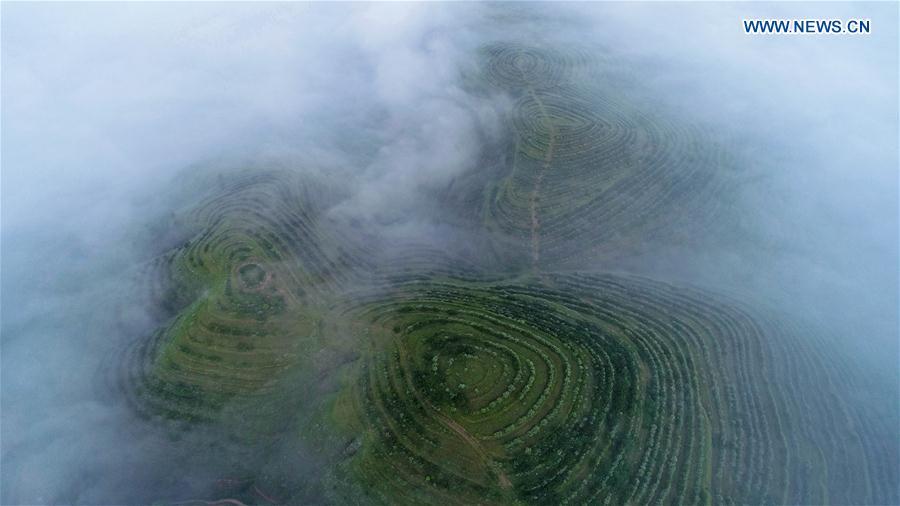 Aerial photo taken on July 17, 2018 shows scenery of Jinjiping terrace park in Pengyuan County, northwest China's Ningxia Hui Autonomous Region. (Xinhua/Wang Peng)