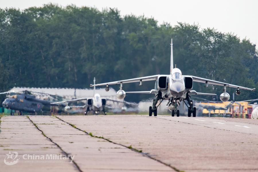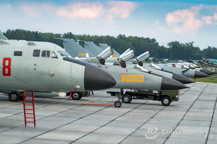Multi-type aircrafts attached to the PLA Air Force sit on sit abreast on the flightline. All aircraft of the PLA Air Force to participate in the "Aviadarts-2018" international competition of the International Army Games 2018 have arrived at the Dyagilevo military airport in Ryazan Oblast, Russia, on July 21, 2018. (Photo/eng.chinamil.com.cn)