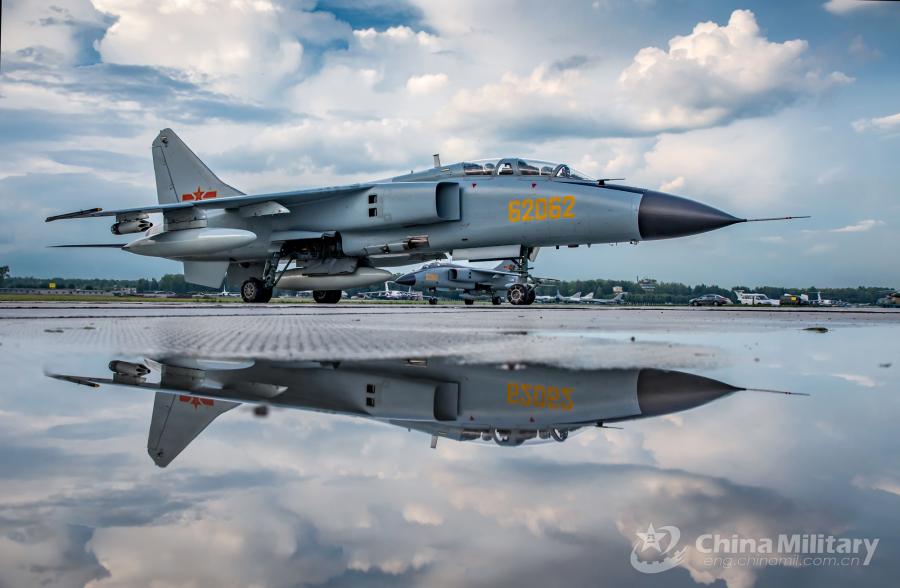 A JH-7A fighter bomber attached to the PLA Air Force arrives at the airport on July 20. All aircraft of the PLA Air Force to participate in the "Aviadarts-2018" international competition of the International Army Games 2018 have arrived at the Dyagilevo military airport in Ryazan Oblast, Russia, on July 21, 2018. (Photo/eng.chinamil.com.cn)