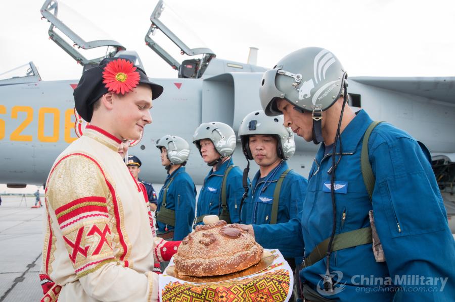 A Russian guy dressed in traditional clothing welcomes the Chinese pilots at the airport on July 20. All aircraft of the PLA Air Force to participate in the "Aviadarts-2018" international competition of the International Army Games 2018 have arrived at the Dyagilevo military airport in Ryazan Oblast, Russia, on July 21, 2018. (Photo/eng.chinamil.com.cn)