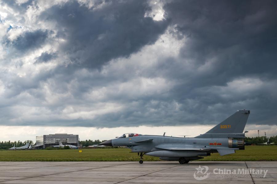 A J-10A fighter jet attached to the Chinese PLA Air Force taxies on runway after landing at the airport on July 21. All aircraft of the PLA Air Force to participate in the "Aviadarts-2018" international competition of the International Army Games 2018 have arrived at the Dyagilevo military airport in Ryazan Oblast, Russia, on July 21, 2018. (Photo/eng.chinamil.com.cn)