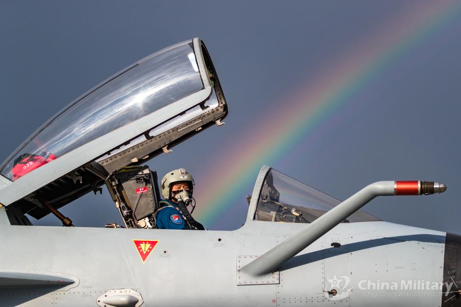 A pilot assigned to the Chinese PLA Air Force sits in the cockpit of his J-10A fighter jet as a rainbow appears in the sky on July 21. All aircraft of the PLA Air Force to participate in the "Aviadarts-2018" international competition of the International Army Games 2018 have arrived at the Dyagilevo military airport in Ryazan Oblast, Russia, on July 21, 2018. (Photo/eng.chinamil.com.cn)