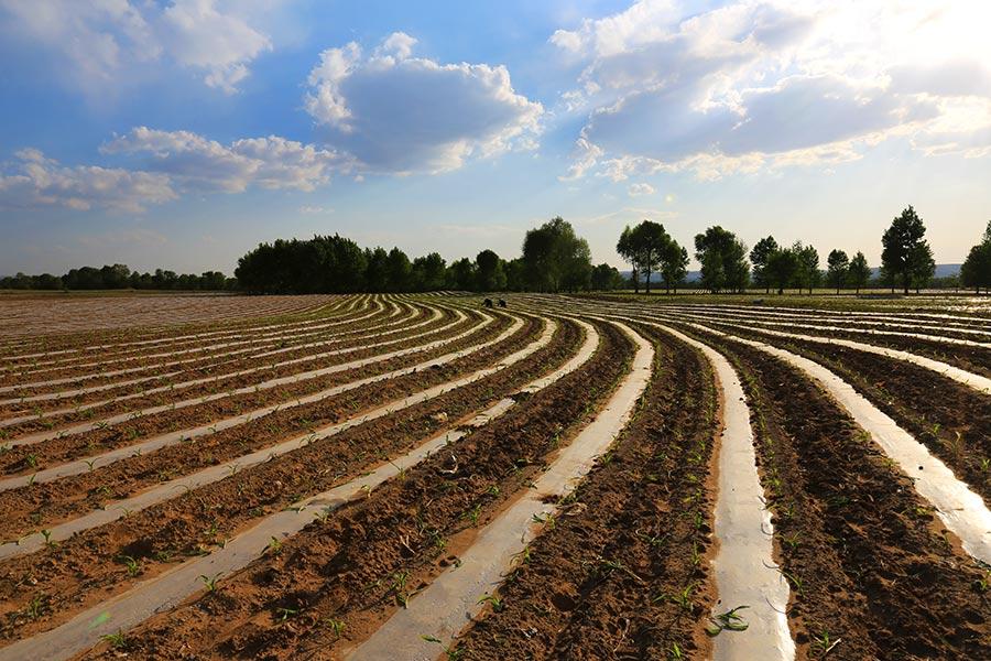Protective film covers large areas of a cornfield in Wuzhai county, North China's Shanxi Province, creating an aerial view that looks like a free-form modern painting. The scene attracts summer tourists who enjoy nature's beauty. (Photo by Jiang Xinsheng/China Daily)