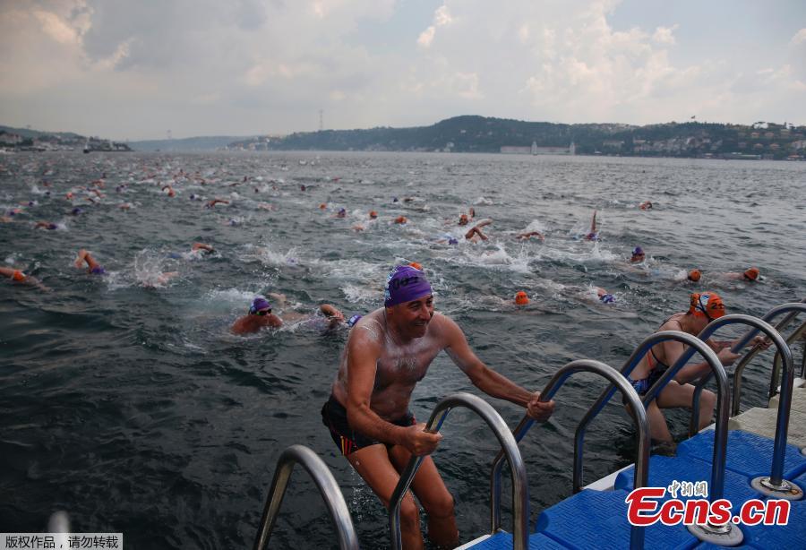 Athletes swim from Asia to Europe in the Bosphorus strait during the Bosporus Cross-Continental Swimming Race in Istanbul, July 22, 2018. Over 2,000 open-water competitors plunged into the water from a ferry docked on the city's Asian side and swam for about 6.5km in the cross-continental event. (Photo/Agencies)