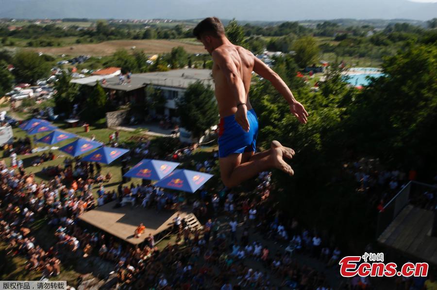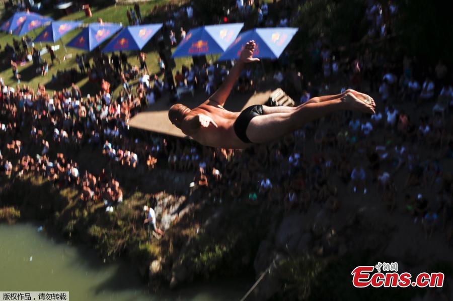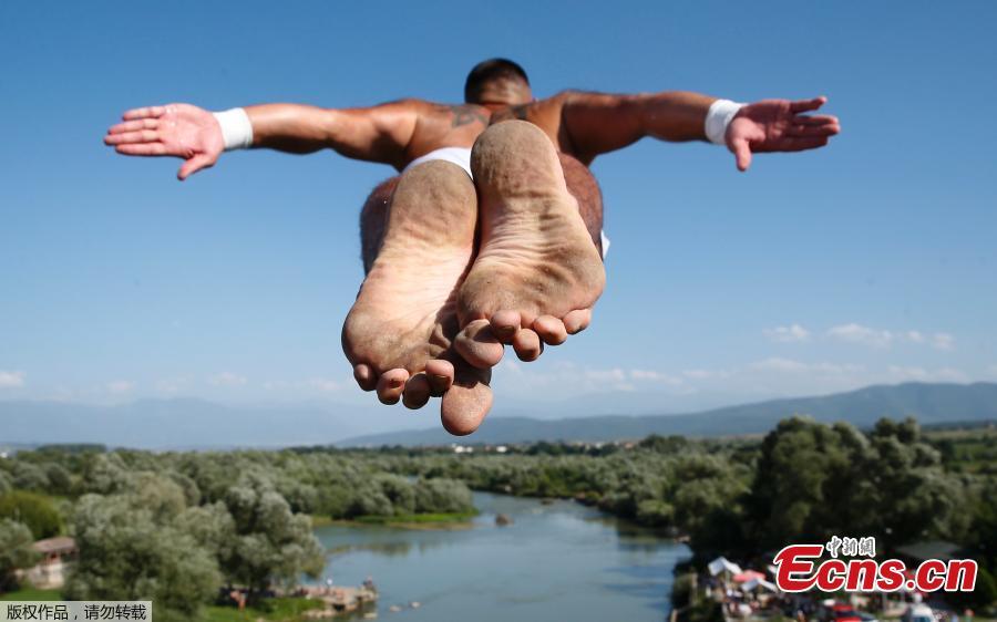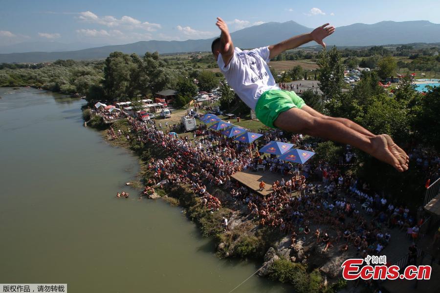 People look at a man as he jumps from the 22 meters high bridge 'Ura e Shenjte' during the annual traditional High Diving competition near the town of Gjakova on July 22, 2018. (Photo/Agencies)