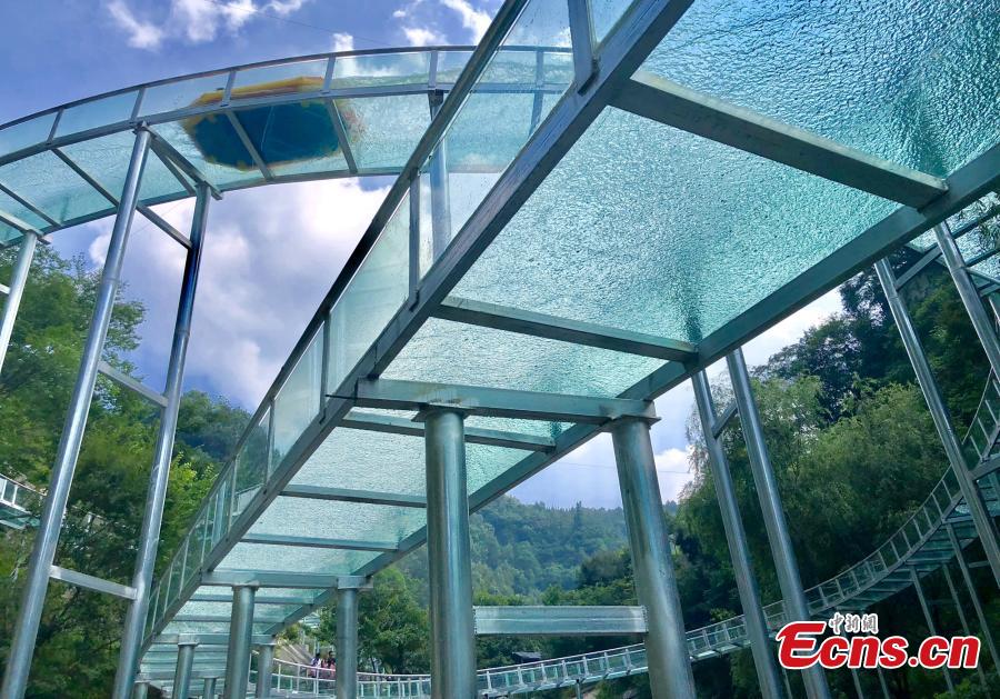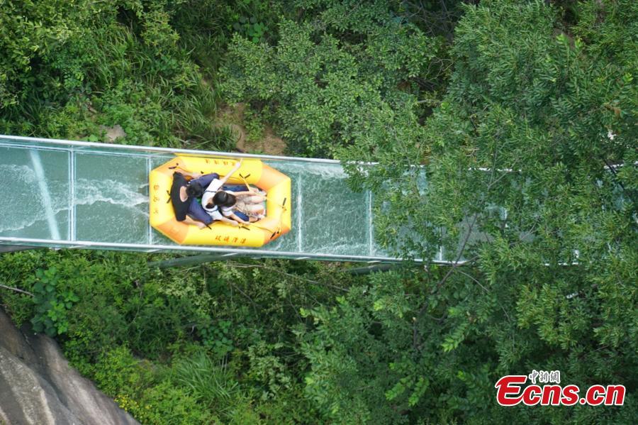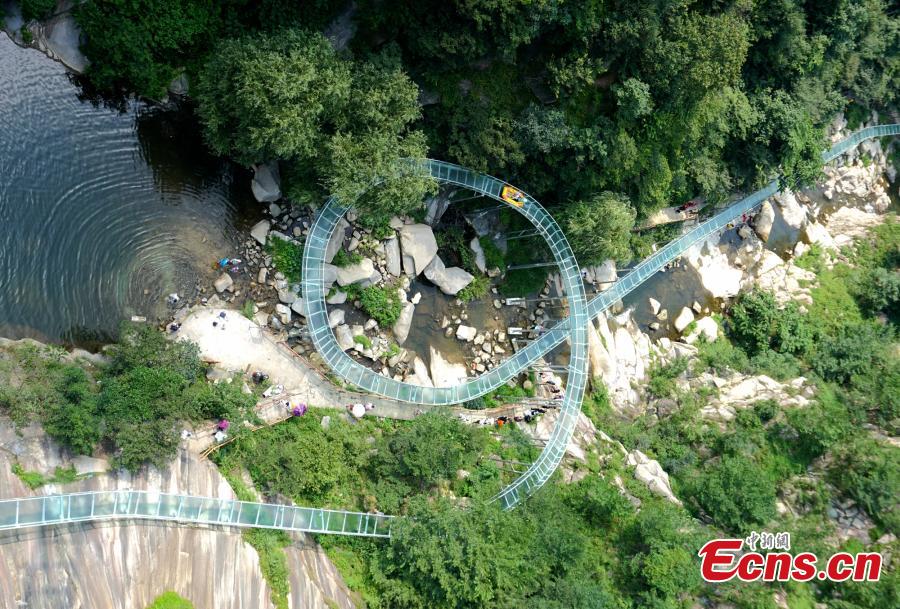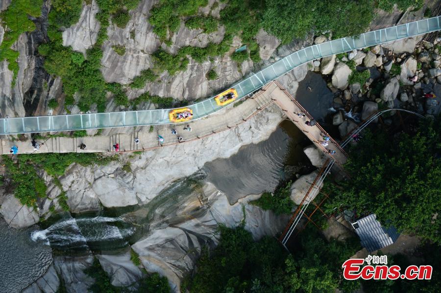 An aerial view of a waterslide over the Xiangma River in Lushan County, Central China’s Henan Province, July 23, 2018. The 2.3-kilometer-long waterslide around a mountain slope and cliff has a vertical drop of 100 meters, earning it the title of the longest and most challenging waterslide in central China. The thrilling project opened on Monday. (Photo: China News Service/Dong Fei)