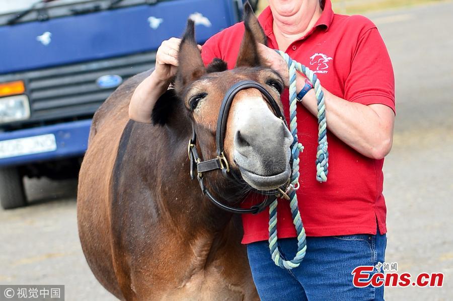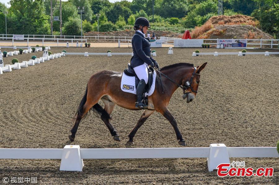 For the first time ever in the UK, Wallace the Great competed in a British Dressage Quest Club competition, held at Summerhouse Equestrian, Gloucestershire on July 22, 2018 ? and beat eight full-horse competitors. Wallace, aged 11, lives in Dursley, Gloucestershire, with two donkeys and another mule who was so badly abused it could not be ridden. (Photo/VCG)