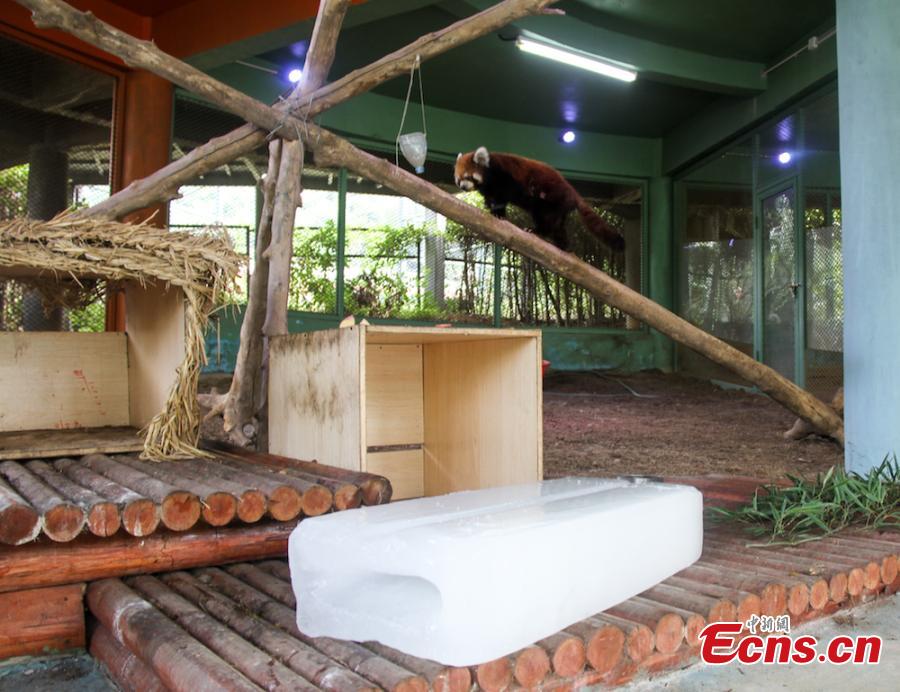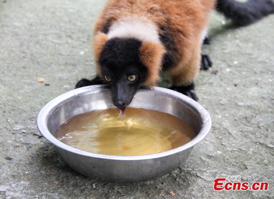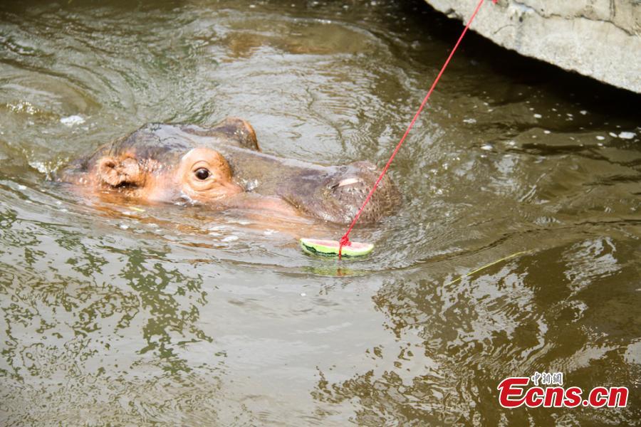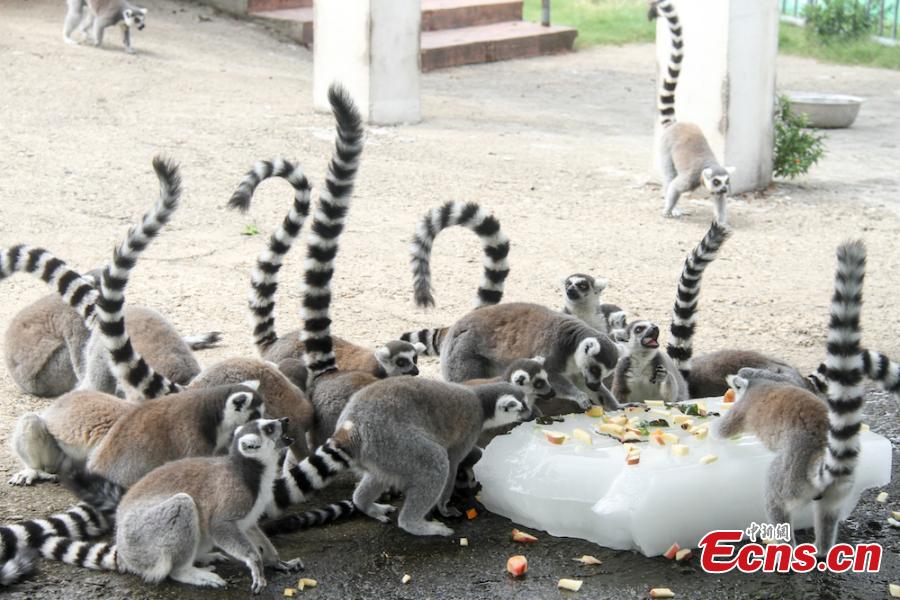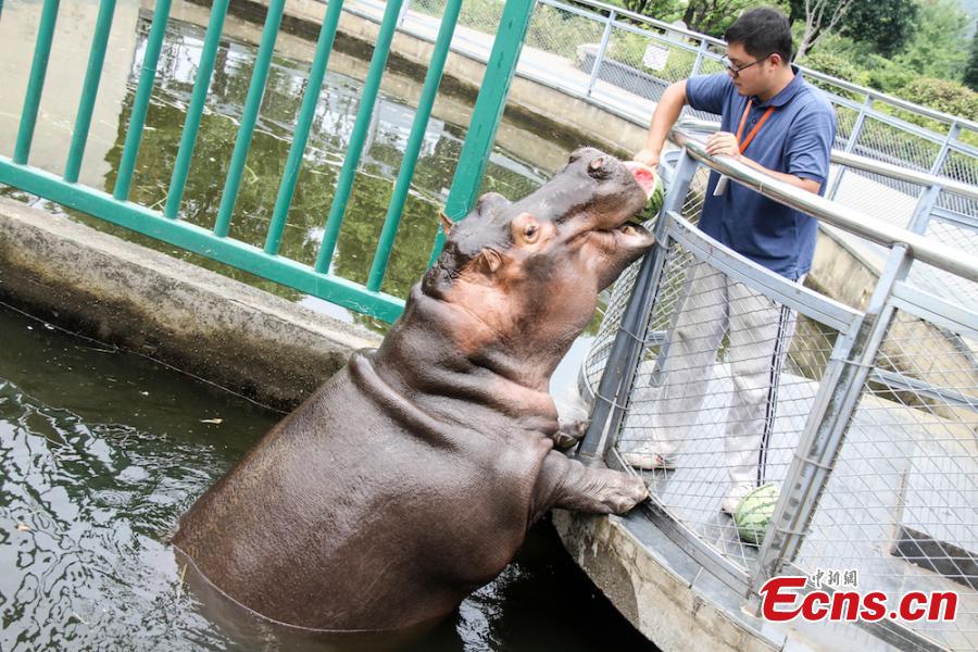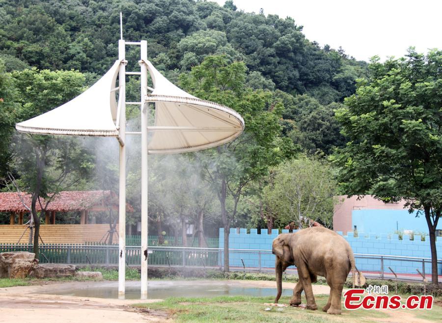 Animals try all possible ways to keep cool on a hot summer's day at Wuxi Zoo in Wuxi City, East China’s Jiangsu Province, July 24, 2018 . The zoo offered ice cubes, watermelon, air-conditioners and automatic water spraying devices to help the animals deal with the summer heat wave. (Photo: China News Service/Sun Quan)