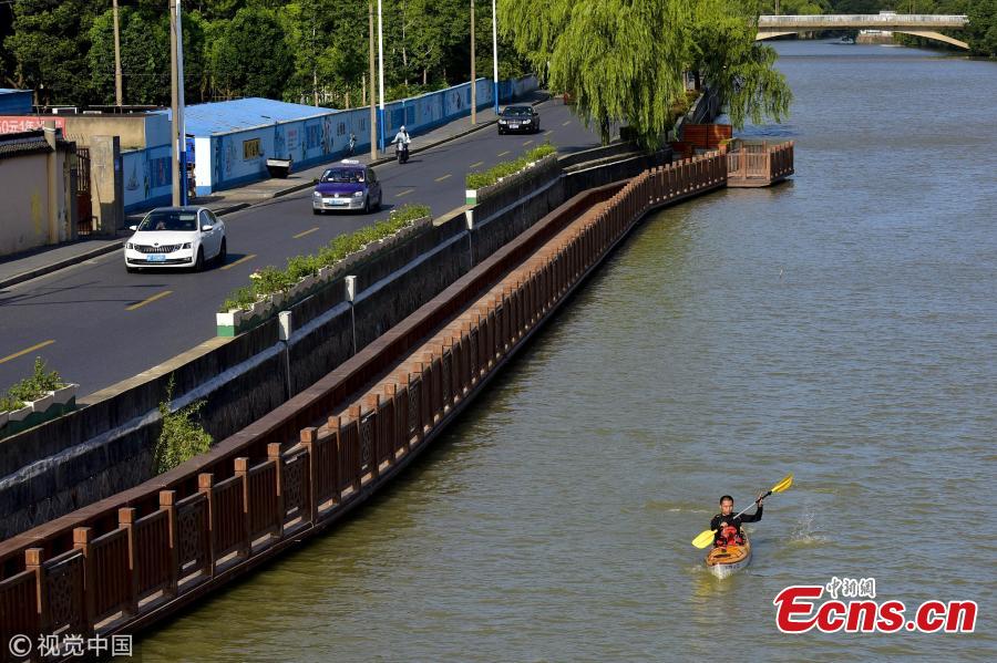 Sports teacher Sun Hua, 34, kayaks to and from a middle school in Jiaxing City, East China’s Zhejiang Province. It usually takes him 25 minutes to complete his three-kilometer journey by water. (Photo/VCG)