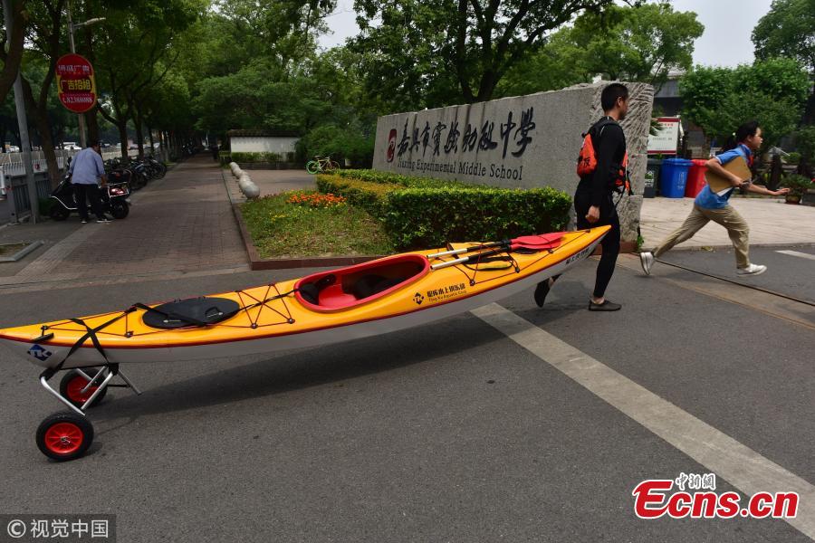 Sports teacher Sun Hua pulls a kayak to a middle school in Jiaxing City, East China’s Zhejiang Province. It usually takes him 25 minutes to complete his three-kilometer journey by water. (Photo/VCG)