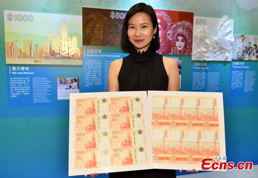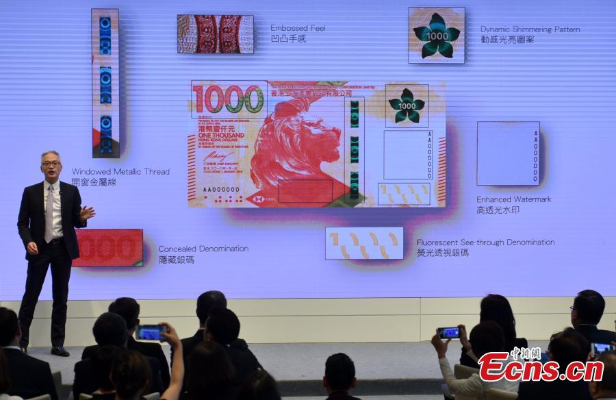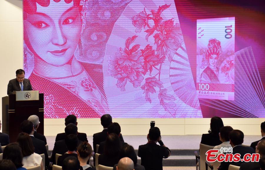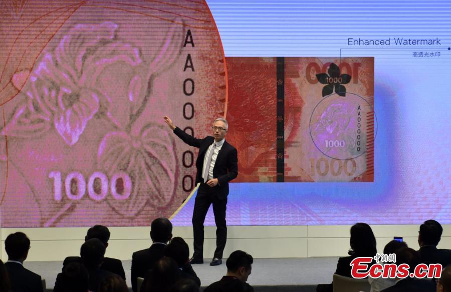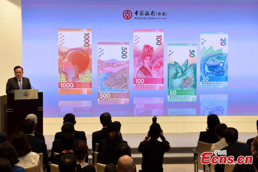The Hong Kong Monetary Authority (HKMA), and the three note-issuing banks (NIBs) (Standard Chartered Bank (Hong Kong) Limited, Bank of China (Hong Kong) Limited and The Hongkong and Shanghai Banking Corporation Limited) announce the issue of the 2018 new series Hong Kong banknotes at a press conference in Hong Kong, July 24, 2018. Hong Kong’s new banknotes will have six advanced security features to prevent counterfeiting, and will showcase the city’s rich natural and cultural heritage. (Photo: China News Service/Zhang Wei)