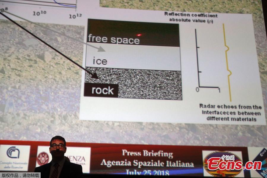 Scientists Roberto Orosei (L), Elena Pettinelli (C) and Enrico Flamini pose near a replica of the Cosmo Sky Med satellite before a news conference where they announce after first-time detection of liquid water on Mars by italian radar Italian radar MARSIS, on board the ESA's Mars at the Italian Space Agency headquarter in Rome, Italy July 25, 2018. (Photo/Agencies)