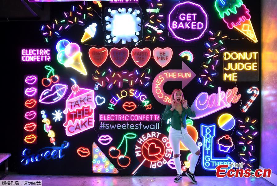 A visitor to Sugar Republic poses in front of a giant wall of neon signs in Melbourne on July 24, 2018. Sugar Republic is an interactive pop-up museum dedicated to the celebration of desserts, candy and all things sweet through 12 amazing sensory rooms.(Photo/Agencies)