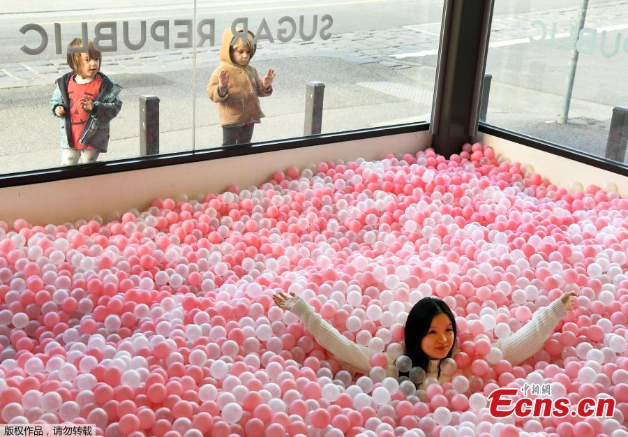 A visitor to Sugar Republic plays in a display of balls resembling lollies in Melbourne on July 24, 2018. Sugar Republic is an interactive pop-up museum dedicated to the celebration of desserts, candy and all things sweet through 12 amazing sensory rooms. (Photo/Agencies)
