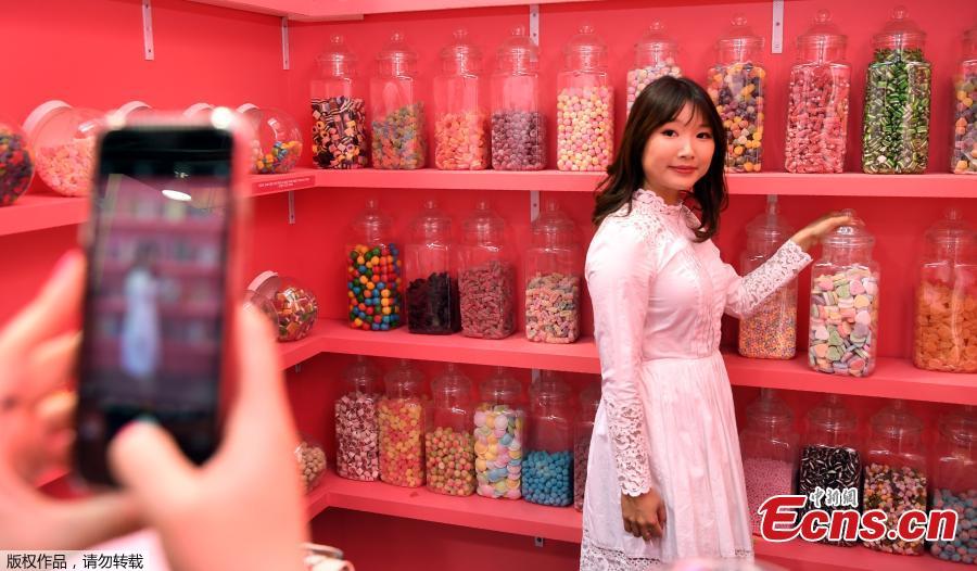 A visitor to Sugar Republic poses for a friend in a display in Melbourne on July 24, 2018. Sugar Republic is an interactive pop-up museum dedicated to the celebration of desserts, candy and all things sweet through 12 amazing sensory rooms.(Photo/Agencies)