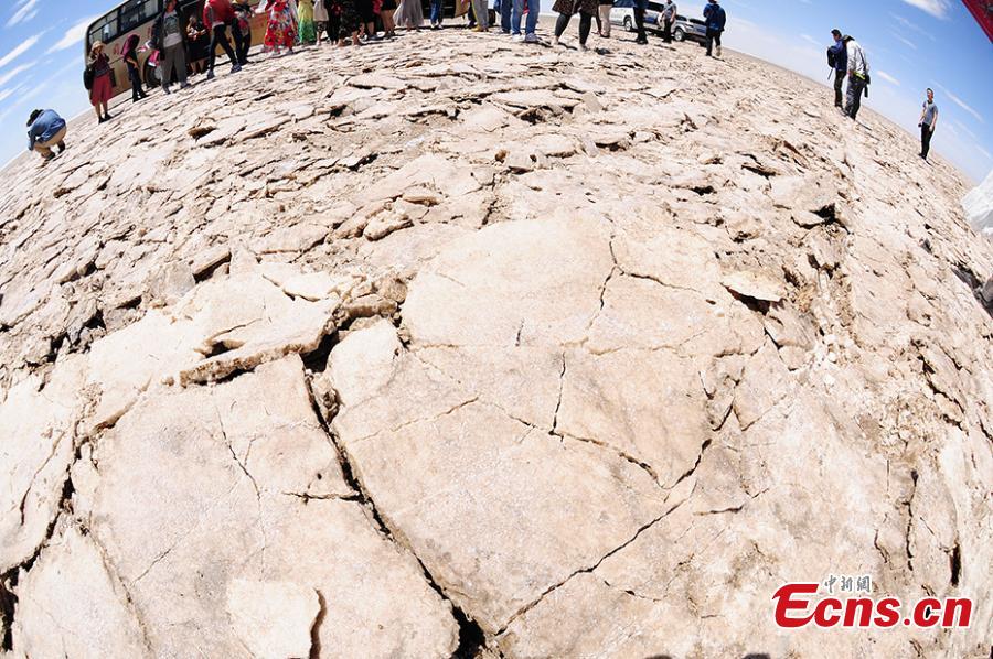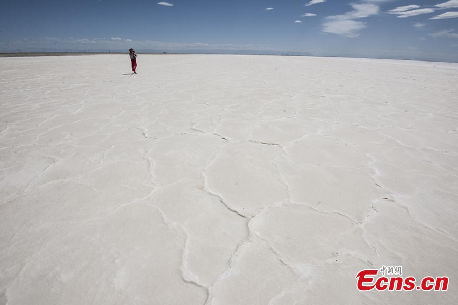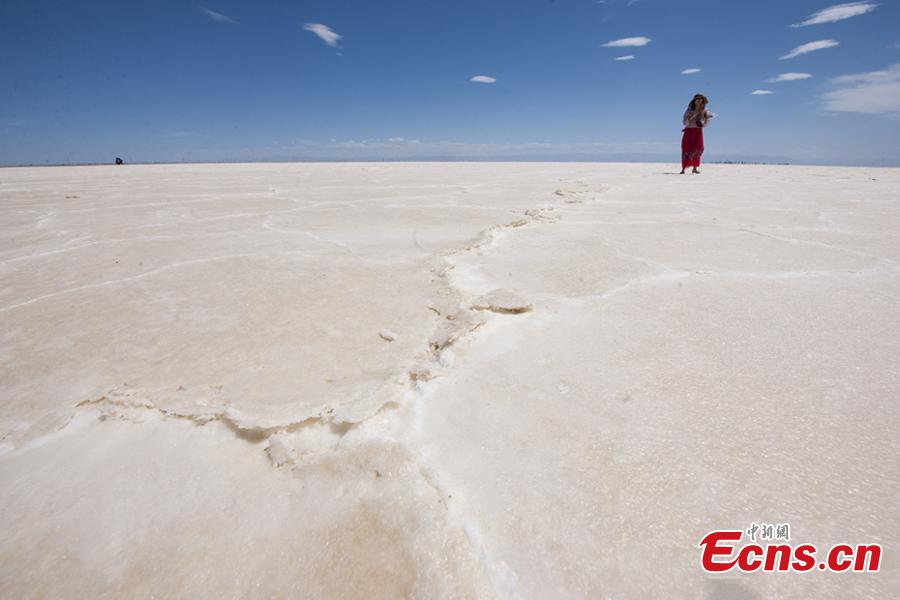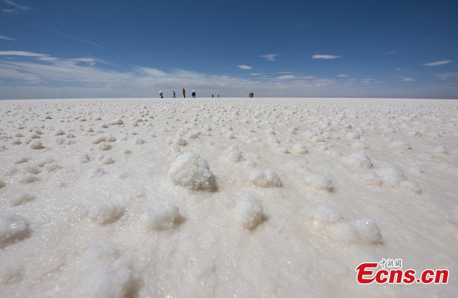 Tourists enjoy the scenery of the Qarhan salt lake in Golmud, Northwest China's Qinghai Province, July 25, 2018. The Qarhan salt lake, with a total area of 5,856 square kilometers, is the largest salt lake in China. The lake's abundant deposit of halide salts makes it a major mineral center. In the vast lake, the salt blossoms like flowers and takes the form of pillars, corals and pearls. (Photo: China News Service/Fu Yu).
