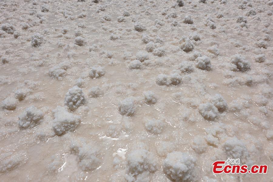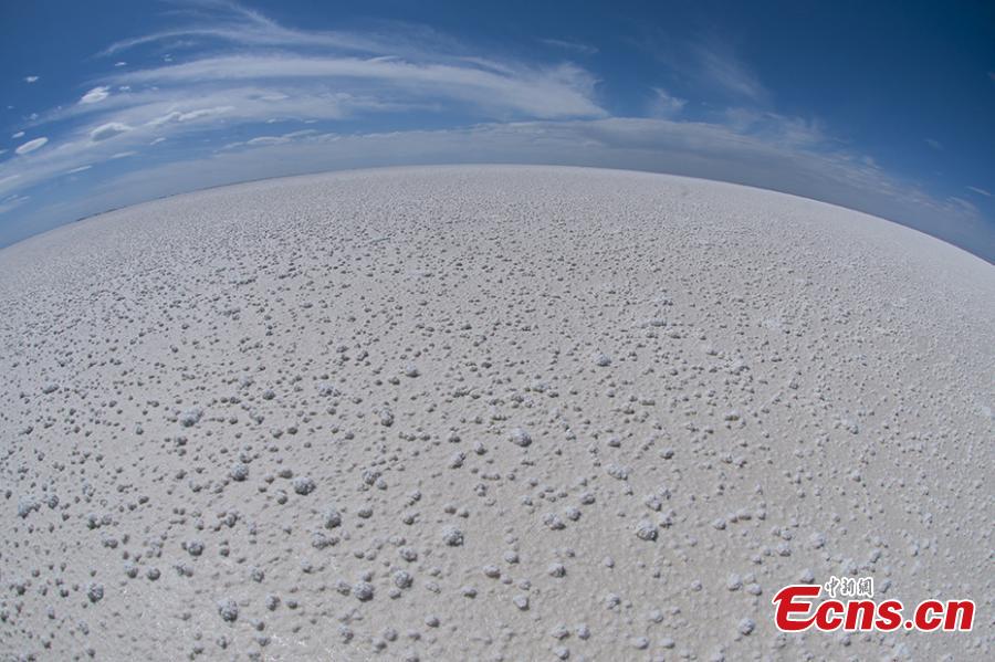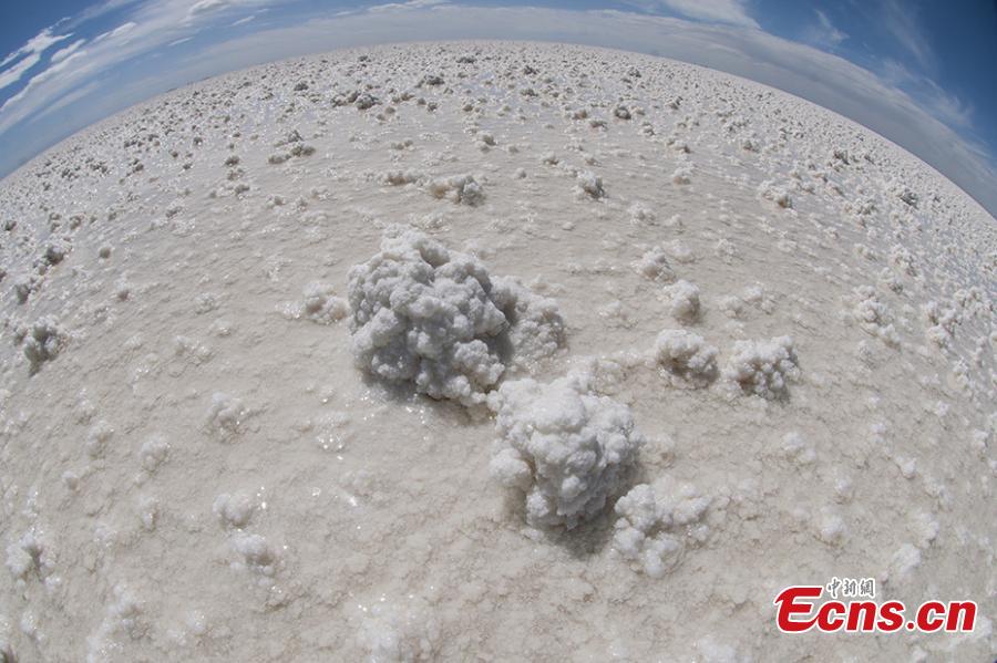 A view of the Qarhan salt lake in Golmud, Northwest China's Qinghai Province, July 25, 2018. The Qarhan salt lake, with a total area of 5,856 square kilometers, is the largest salt lake in China. The lake's abundant deposit of halide salts makes it a major mineral center. In the vast lake, the salt blossoms like flowers and takes the form of pillars, corals and pearls. (Photo: China News Service/Fu Yu).