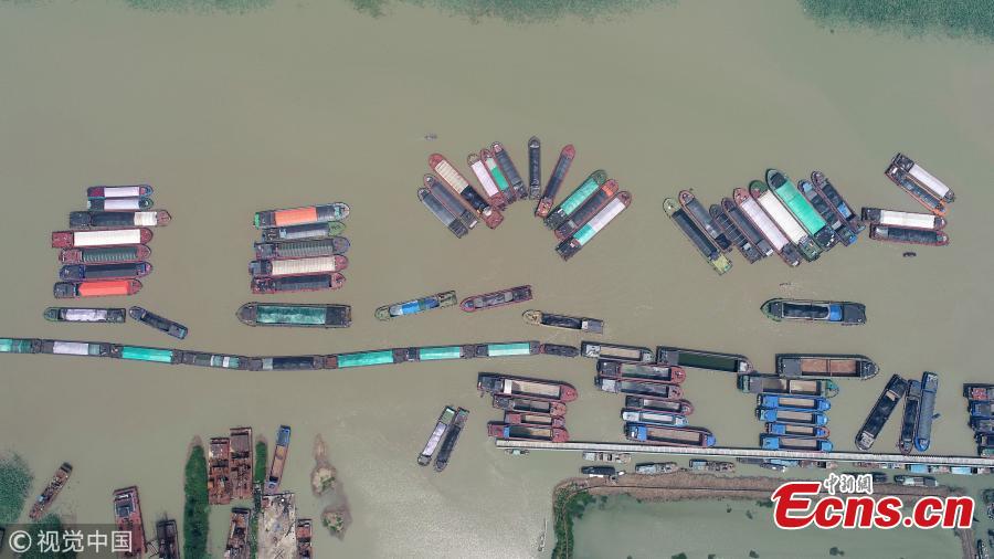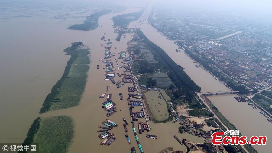 An aerial view of ships waiting to pass a navigation lock in Hongze Lake, Huaian City, East China’s Jiangsu Province, July 25, 2018. Thousands of ships had to berthed in port for days due to tropical storm Ampil. (Photo/VCG)