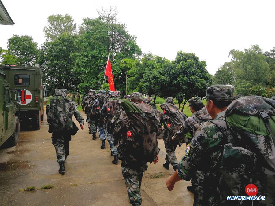 A Chinese People's Liberation Army (PLA) medical team arrive at the flooded-area in Attapeu, Laos, July 26, 2018. A medical contingent from the Chinese People's Liberation Army (PLA), which is on the "Peace Train-2018" Humanitarian Medical Rescue Joint Training Mission in the Lao capital of Vientiane, arrived in Laos' southern Attapeu province Wednesday to help with relief work after a hydropower dam collapsed earlier this week. (Xinhua/Liu Ailun)