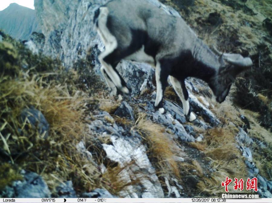 An image taken by an infrared camera shows a bharal in the Wolong Natural Reserve in Sichuan Province. It is the first time in 30 years a leopard has been found in the reserve, a core part of the Sichuan giant panda sanctuaries. Infrared cameras also caught images of snow leopards and three black bears cubs in the same frame. (Photo: China News Service/Zhong Xin)