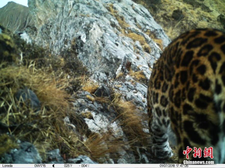 An image taken by an infrared camera shows a leopard in the Muxiangpo area, 4,080 meters above sea level, in the Wolong Natural Reserve in Sichuan Province. It is the first time in 30 years a leopard has been found in the reserve, a core part of the Sichuan giant panda sanctuaries. Infrared cameras also caught images of snow leopards and three black bears cubs in the same frame. (Photo: China News Service/Zhong Xin)
