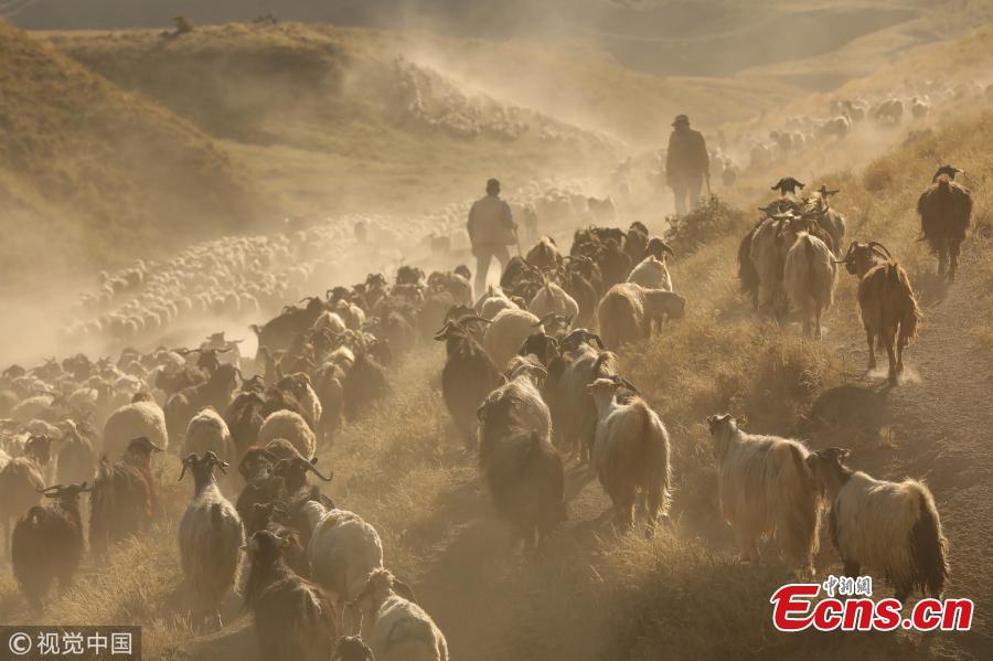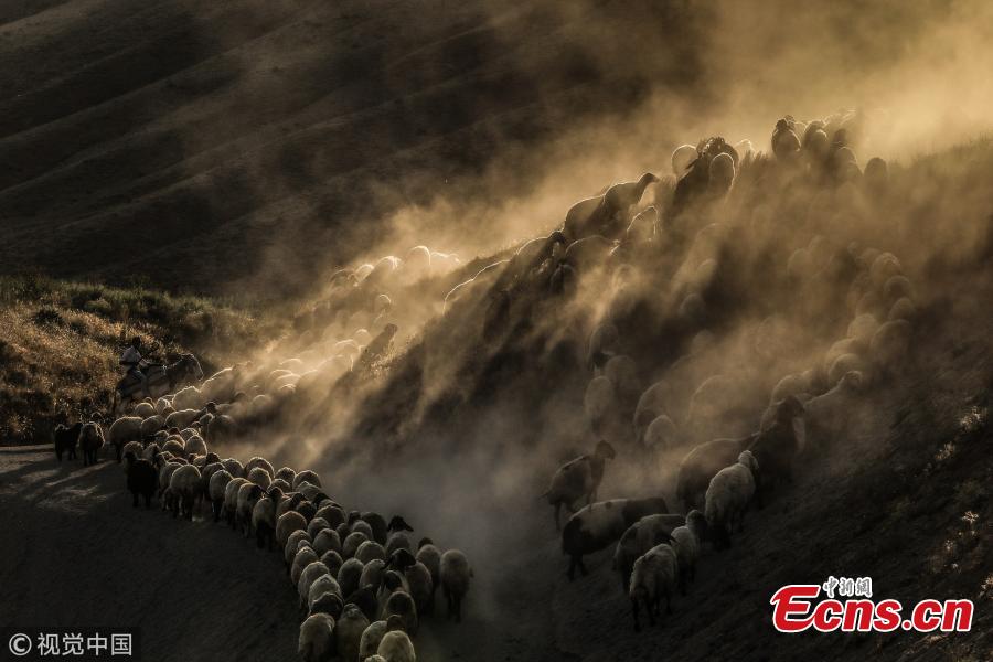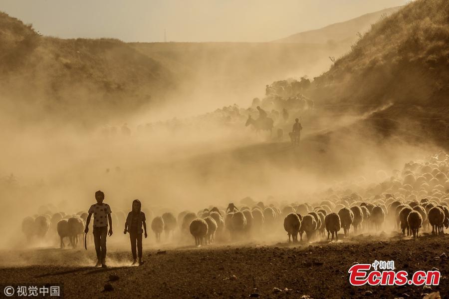 Sheep, brought by shepherds for pasturing to Kiyiduzu village, travel among the dust through the foothills of Mount Nemrut during sunset in Tatvan district of Bitlis, Turkey, July 26, 2018. (Photo/VCG)