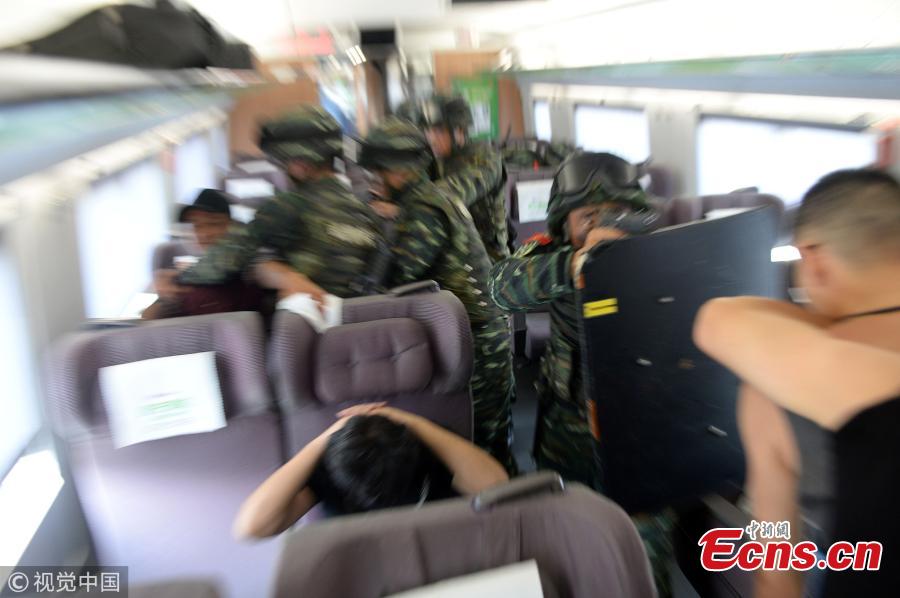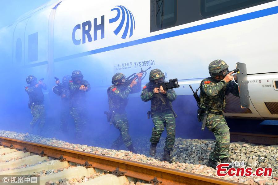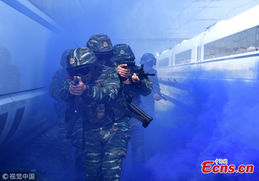 Armed police officers take part in a drill that simulated a hostage-taking crisis on a high-speed train in Hefei City, East China’s Anhui Province, July 30, 2018. The drill aimed to enhance preparedness against transportation emergencies. (Photo/VCG)