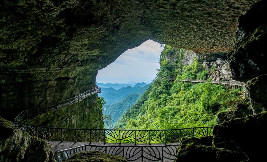 A walkway circles the interior of a cave at Jinfo Mountain in Chongqing municipality. (Photo provided to chinadaily.com.cn)