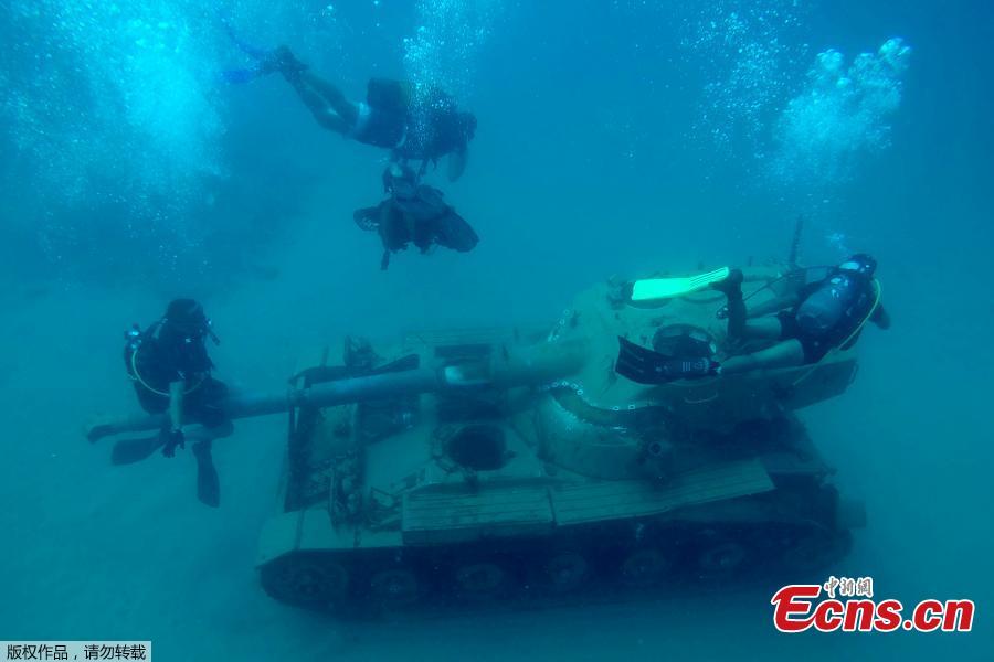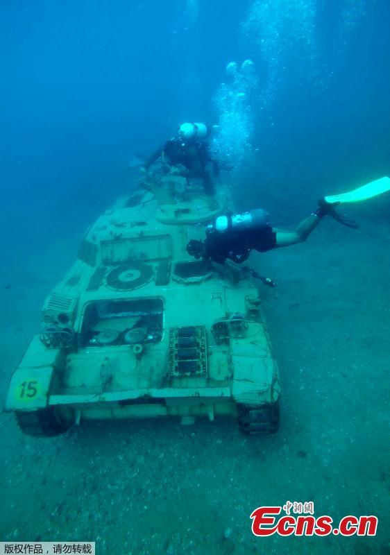 Divers swim around immersed tanks off the coast of Sidon, Lebanon, July 28, 2018. Lebanese environmentalists sank 10 old tanks and other armored vehicles to the bottom of the Mediterranean Sea in a novel attempt to attract divers and create new habitats for marine life. (Photo/Agencies)