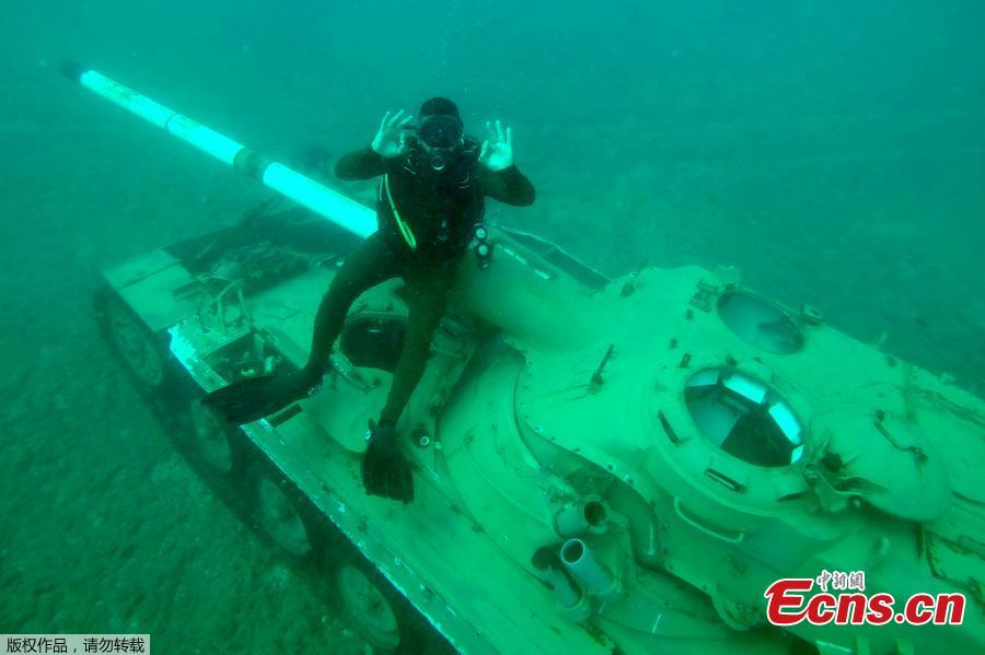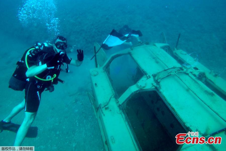 A diver gestures near an immersed tank off the coast of Sidon, Lebanon, July 28, 2018. Lebanese environmentalists sank 10 old tanks and other armored vehicles to the bottom of the Mediterranean Sea in a novel attempt to attract divers and create new habitats for marine life. (Photo/Agencies)