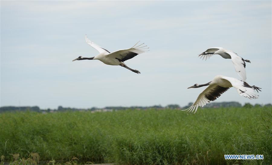 Red-crowned cranes are seen at Zhalong National Nature Reserve in Qiqihar, northeast China's Heilongjiang Province, Aug. 1, 2018. Zhalong National Nature Reserve, covering 2,100 square kilometers, was set up in 1979 in a northeast China's reed wetland. It provides a major habitat for red-crowned cranes and other wildlife. (Xinhua/Wang Kai)