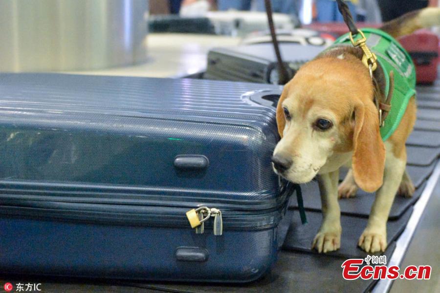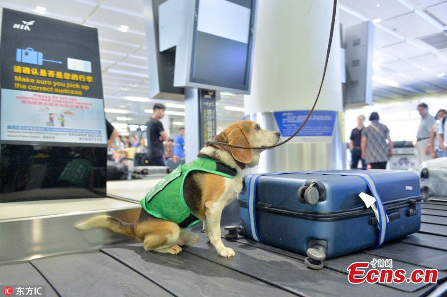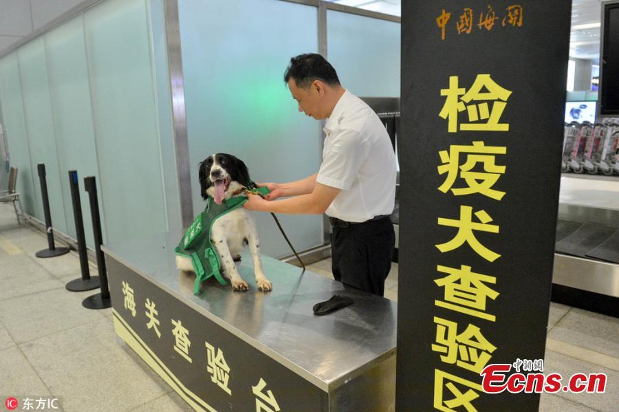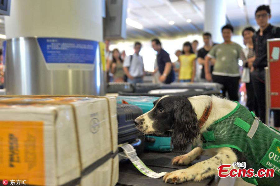 A sniffer dog works at the Hangzhou Xiaoshan International Airport in Hangzhou City, East China’s Zhejiang Province. Customs authorities at the airport have six sniffer dogs to assist with quarantine inspections. (Photo/IC)