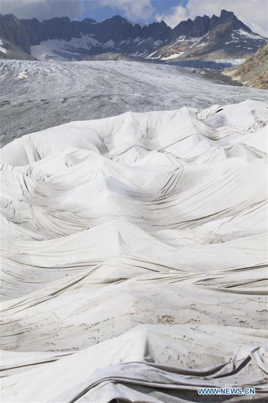 Photo taken on Aug. 5, 2018 shows the Rhone Glacier covered with white blankets near the Furka Pass in Switzerland. The Rhone Glacier is protected by special white blankets to prevent it from further melting as a result of global warming. (Xinhua/Xu Jinquan)