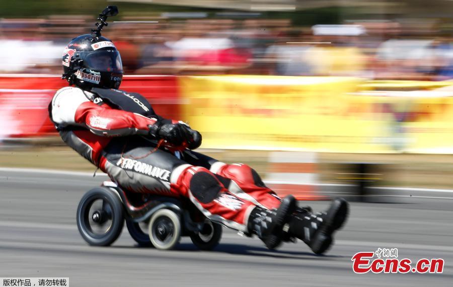 German extreme athlete Dirk Auer drives on his jet-powered Bobby car to set a new world record at 119.68 km/h during an airport racing event in Bottrop-Kirchhellen, western Germany, Aug. 5, 2018. (Photo/Agencies)