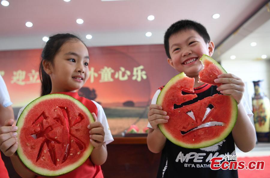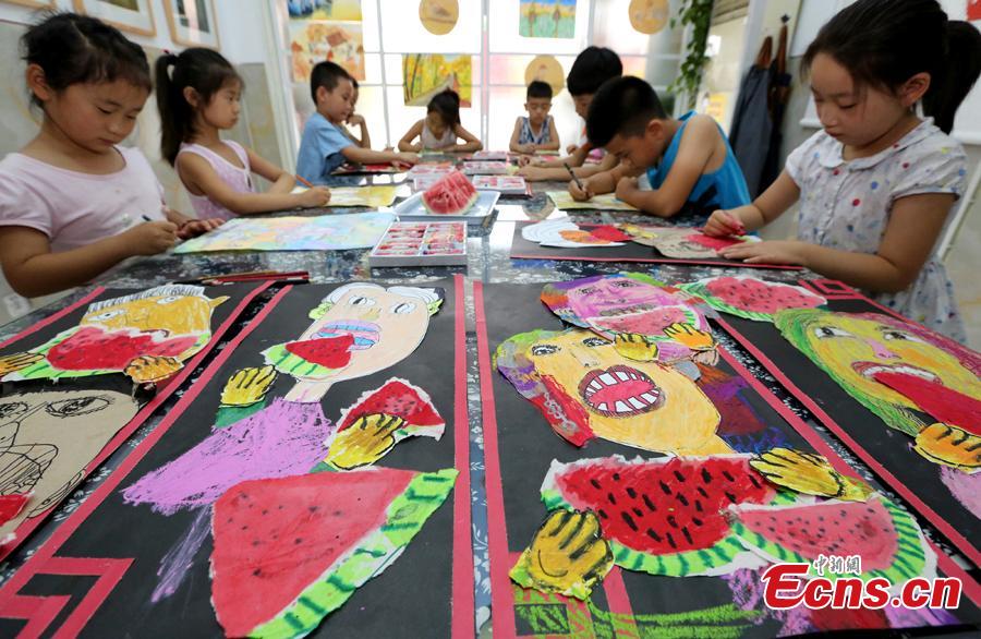 Children celebrate "Start of Autumn", 13th of the 24 annul solar terms, by drawing watermelon at a community in Hefei City, Anhui Province on Aug. 6, 2018.
