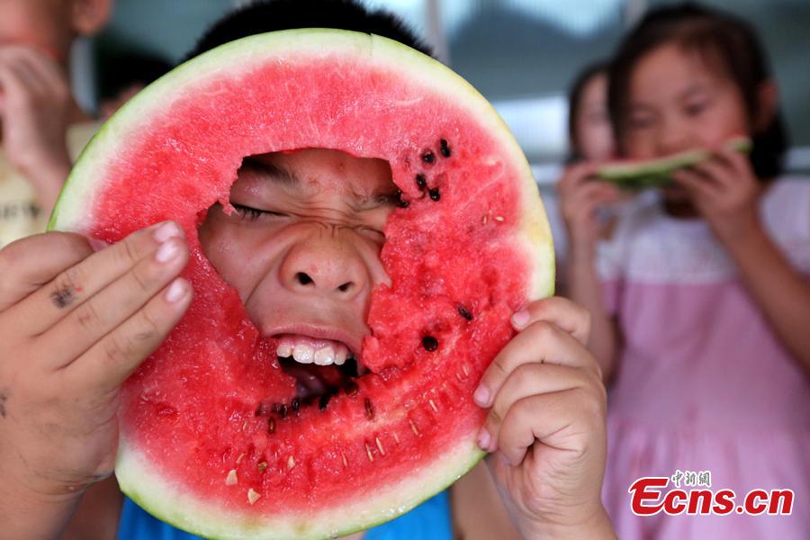 Children celebrate "Start of Autumn", 13th of the 24 annul solar terms, by eating watermelon at a community in Hefei City, Anhui Province on Aug. 6, 2018. (Photo: China News Service/Han Suyuan)