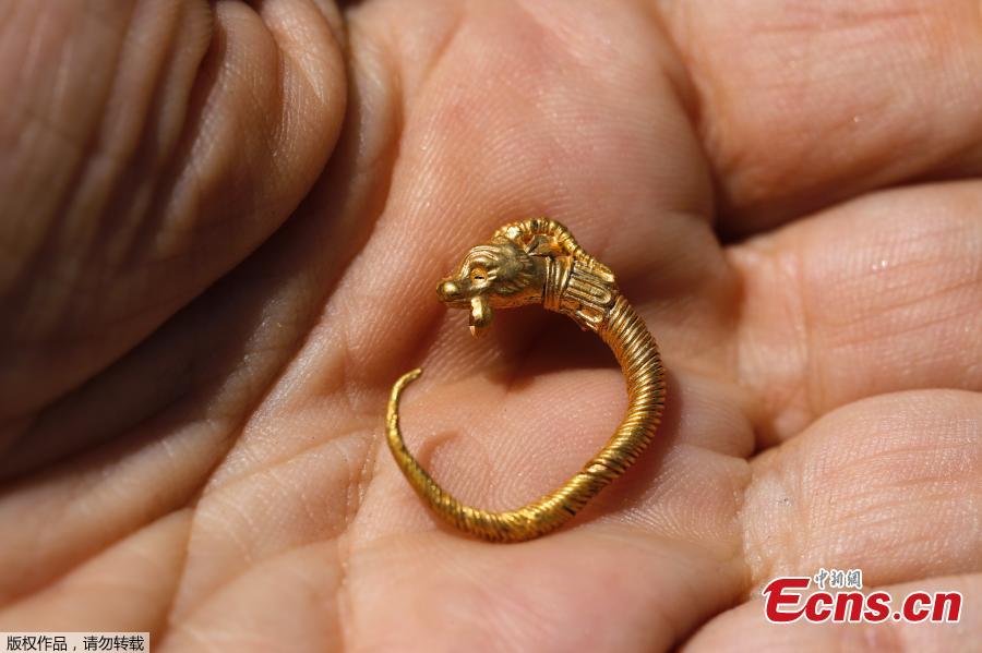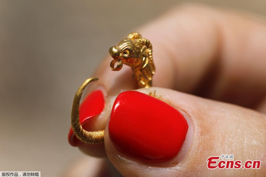 An Israeli archeologist shows a rare golden earring believed to be more than 2,000 years-old, discovered at the archeological site of the City of David in East Jerusalem near the walls of the old city on 8 August 2018. A Hellenistic-era golden earring, featuring ornamentation of an horned animal, was discovered in the Givati Parking Lot in the City of David National Park encircling the Old City walls. The discovery was made during archeological digs carried out by the Antiquities Authority and Tel Aviv University. The spectacular gold earring, shaped like a horned animal, dates back to the second or third century BCE, during the Hellenistic period. (Photo/Agencies)