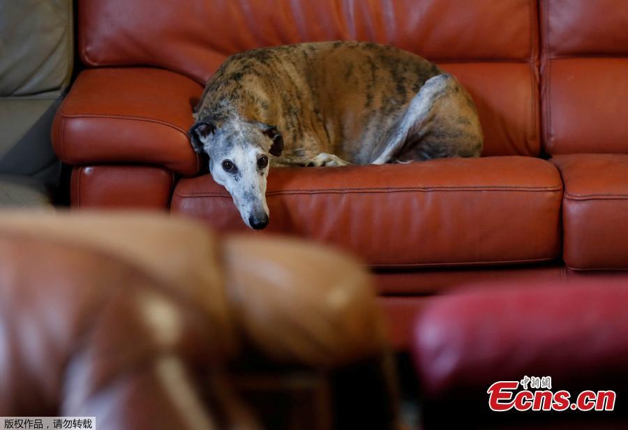 Caracol, a ten-years old Spanish Galgo, rests on a sofa at the association "Les Petits Vieux", home for dozens of elderly animals, including dogs, cats, pigs and goats in Chievres, Belgium August 7, 2018. (Photo/VCG)