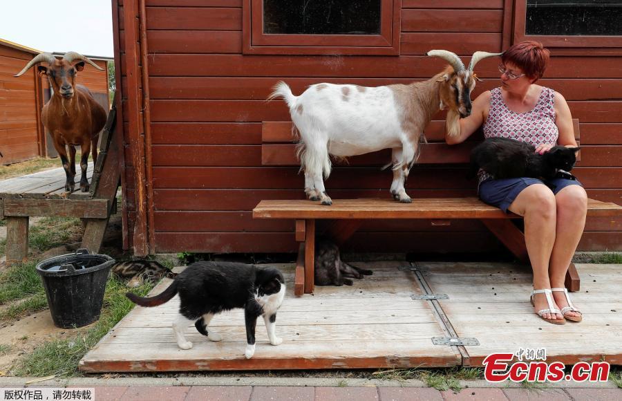Belgian Valerie Luycx, a founder of the association "Les Petits Vieux" acting as home for elderly animals, including dogs, cats, pigs and goats, sits next to Chasse, a goat, in Chievres, Belgium August 7, 2018. (Photo/VCG)