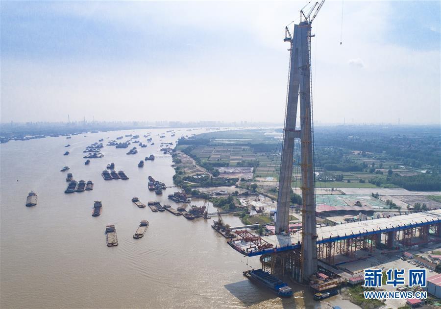 Photo taken on Aug. 8, 2018 shows a nearly 500-ton steel box girder has been installed on the Qingshan Yangtze River Bridge under construction in Wuhan City, Hubei Province. It marked a milestone in building the bridge’s main span. (Photo/Xinhua)