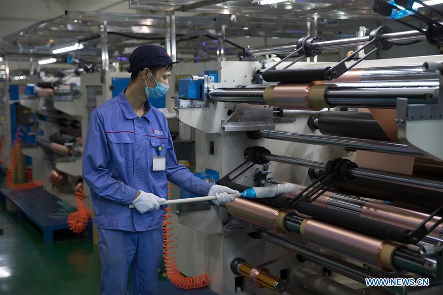 A staff member works on a production line of copper foil for making lithium battery at Huachuang New Material Co., Ltd in Tongling City, east China's Anhui Province, Aug. 8, 2018. Tongling government takes measures to improve ecological environment and develop green industry along the Yangtze River. (Xinhua/Jin Liwang)