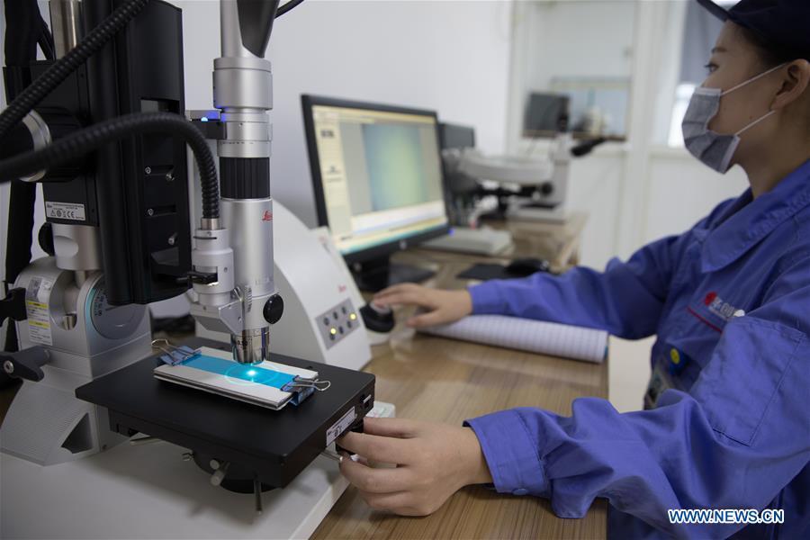 A staff member checks a piece of copper foil product for making lithium battery at Huachuang New Material Co., Ltd in Tongling City, east China's Anhui Province, Aug. 8, 2018. Tongling government takes measures to improve ecological environment and develop green industry along the Yangtze River. (Xinhua/Jin Liwang)