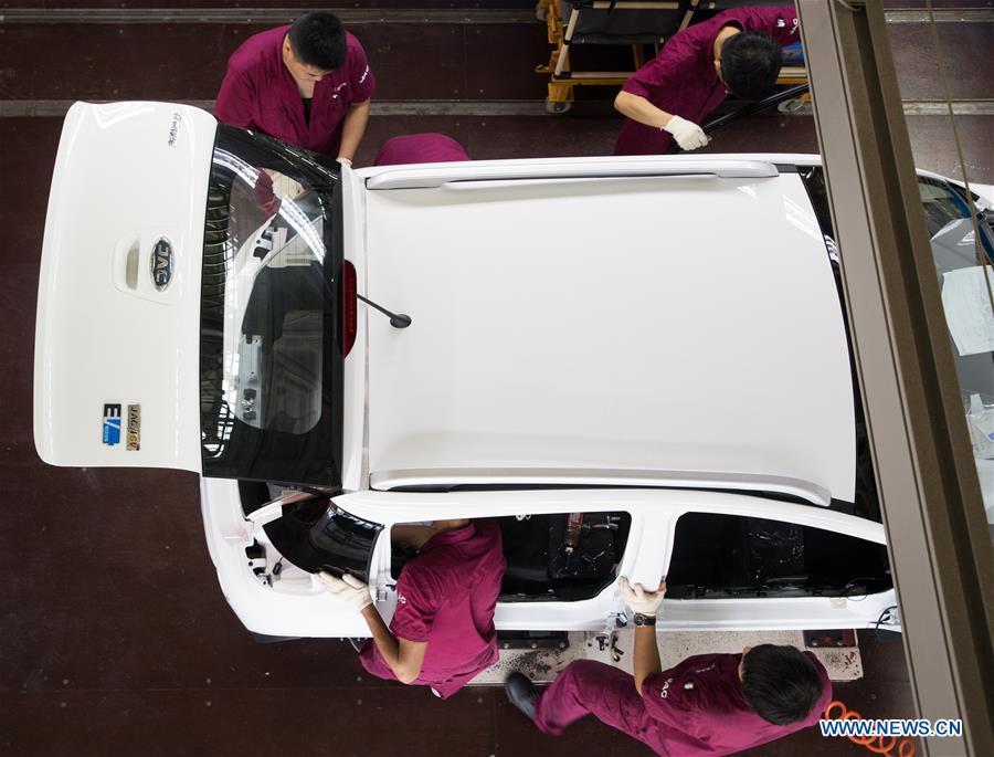 Staff members work on a production line of new energy vehicles at a JAC Motors factory in Tongling City, east China's Anhui Province, Aug. 7, 2018. Tongling government takes measures to improve ecological environment and develop green industry along the Yangtze River. (Xinhua/Jin Liwang)