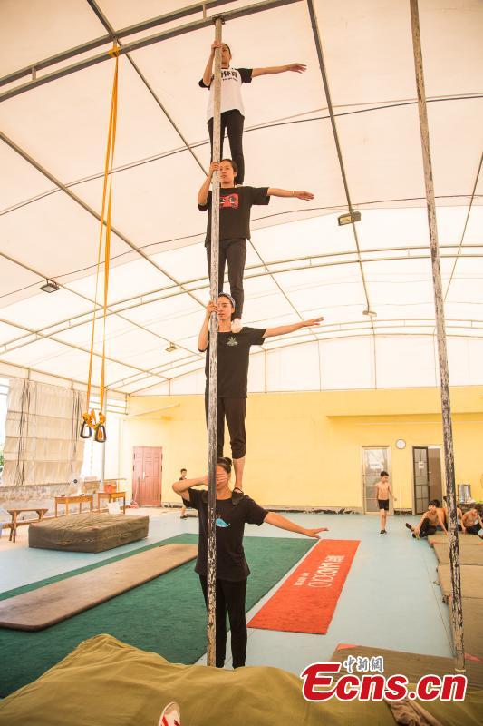 Acrobat Li Xianhui, 22, trains with other members at a gym in Nanning, the capital of South China’s Guangxi Zhuang Autonomous Region, Aug. 9, 2018. Most of the children training with the acrobatics troupe led by Li Dewei are from the poverty-stricken Mashan County and they dream of one day improving the financial position of their families through their performances. A member of the acrobatics troupe for ten years, Li has performed in many countries. (Photo: China News Service/Chen Guanyan)