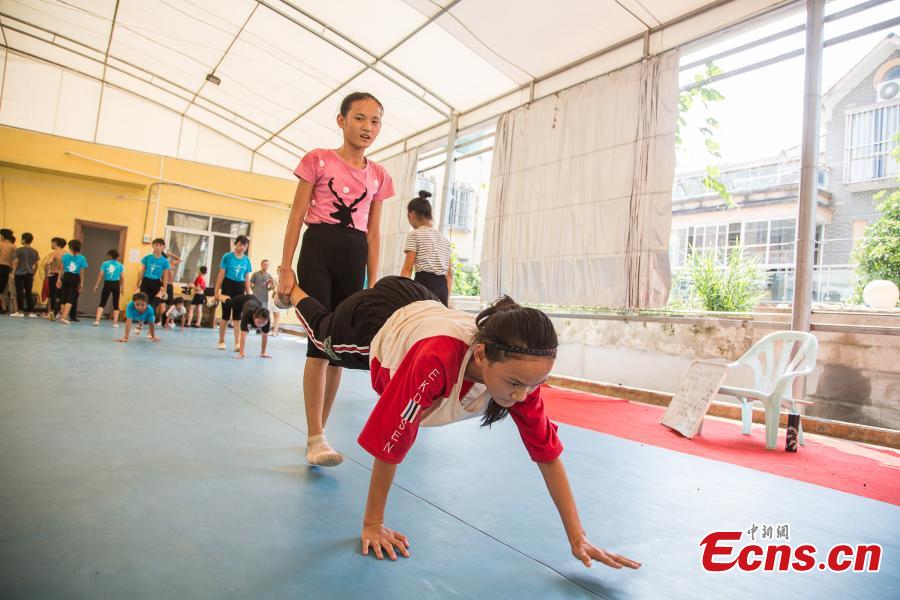 Children acrobats train at a gym in Nanning, the capital of South China’s Guangxi Zhuang Autonomous Region, Aug. 9, 2018. Most of the children training with the acrobatics troupe led by Li Dewei are from the poverty-stricken Mashan County and they dream of one day improving the financial position of their families through their performances. (Photo: China News Service/Chen Guanyan)