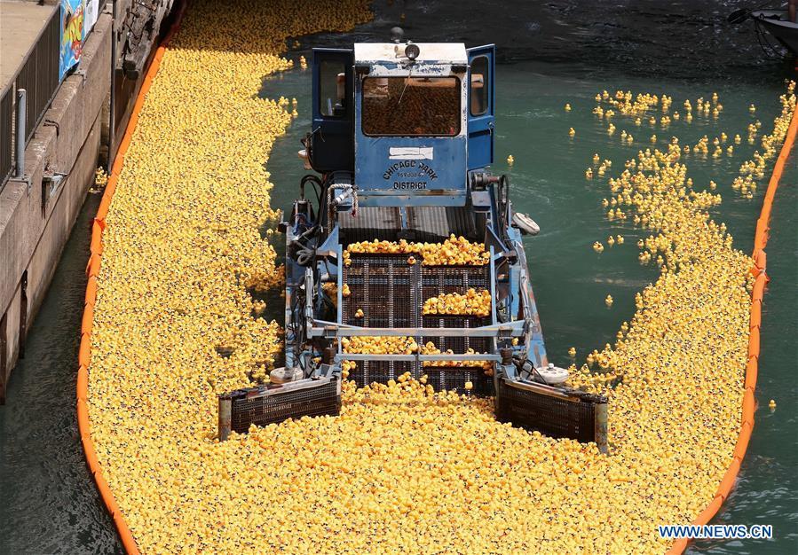 A volunteer recovers rubber ducks from the Chicago River following the 13th Annual Chicago Ducky Derby in Chicago, the United States, Aug. 9, 2018. Derby organizers dropped about 60,000 rubber ducks into the Chicago river on Thursday to start the Rubber Ducky Derby this year, which helps raise money for Special Olympics Illinois. (Xinhua/Wang Ping)