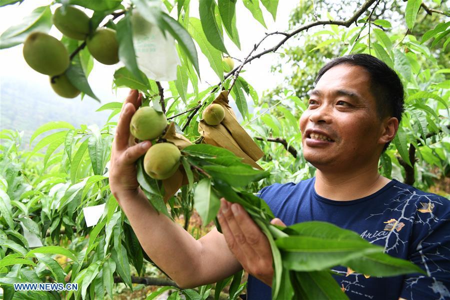 Shen Jianzhong checks the condition of peaches at a planting base in the Wulong District of Chongqing, southwest China, June 15, 2018. Shen Jianzhong, a 47-year-old villager of Fazi Village, developed a desertification-tolerant peach variety and helped villagers to get rid of poverty. (Xinhua/Wang Quanchao)