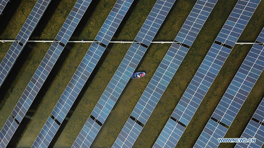 Aerial photo taken on Aug. 9, 2018 shows a photovoltaic power plant built above the fish pond in Yintu Township of Jinhu County, east China's Jiangsu Province. (Xinhua/Li Yuze)